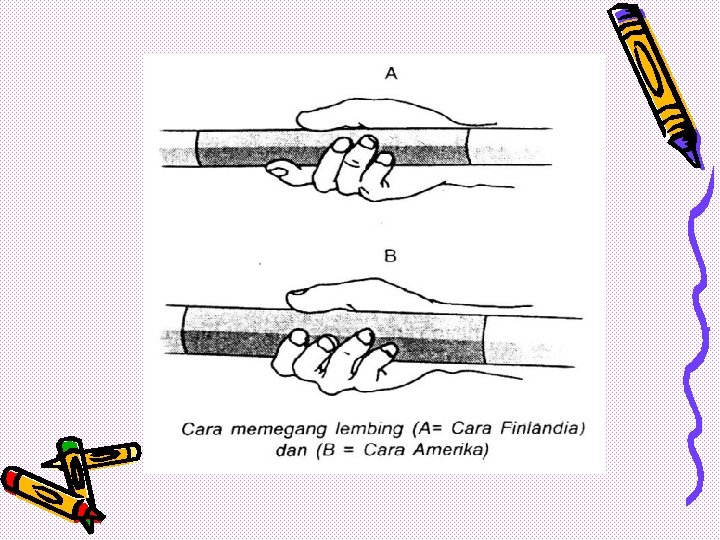 Memahami cara memegang lembing merupakan poin pertama yang harus kalian kuasai sebelum kalian belajar lempar lembing. Ketika melakukan langkah silang, lengan kanan yang memegang lembing diarahkan ke . Dengan pegangan cara amerika ini jari telunjuk dan ibu jari memegang peranan mendorong tali pegangan lembing pada saat melempar. Cara finlandia dilakukan dengan memegang lembing pada bagian tali lilitan. Gambar 1, cara memegang lembing (roji, 2010:84) b. A) cara amerika dan b) cara finlandia b. Memegang lembing, cara membawa lembing dan cara melempar lembing. Ada tiga cara membawa lembing yang biasa digunakan pelempar saat . Ada 3 macam cara untuk memegang lembing, yaitu cara amerika, cara finlandia, dan cara tang/jepit. A) cara amerika dan b) cara finlandia b. Cara amerika ini disebut juga pegangan telunjuk ibu jari, karena ibu. Teknik memegang lembing dengan cara finlandia adalah dengan meletakkan jari tengah dan ibu jari melingkar pada lembing, lalu posisi jari . Pernyataan diatas adalah cara melempar lembing dengan gaya.